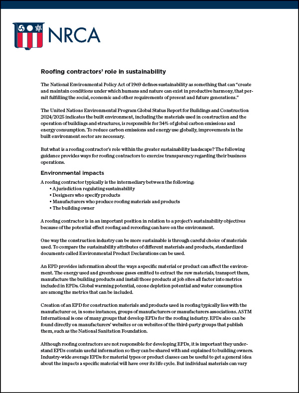 NRCA recently released Roofing Contractors’ Role in Sustainability, a white paper that offers guidance addressing how roofing contractors can exercise transparency regarding sustainability and their business operations.