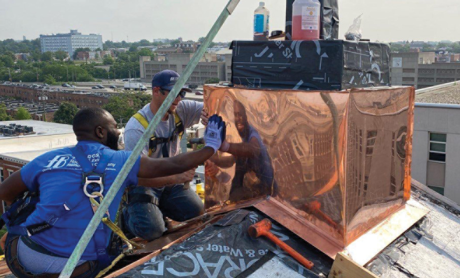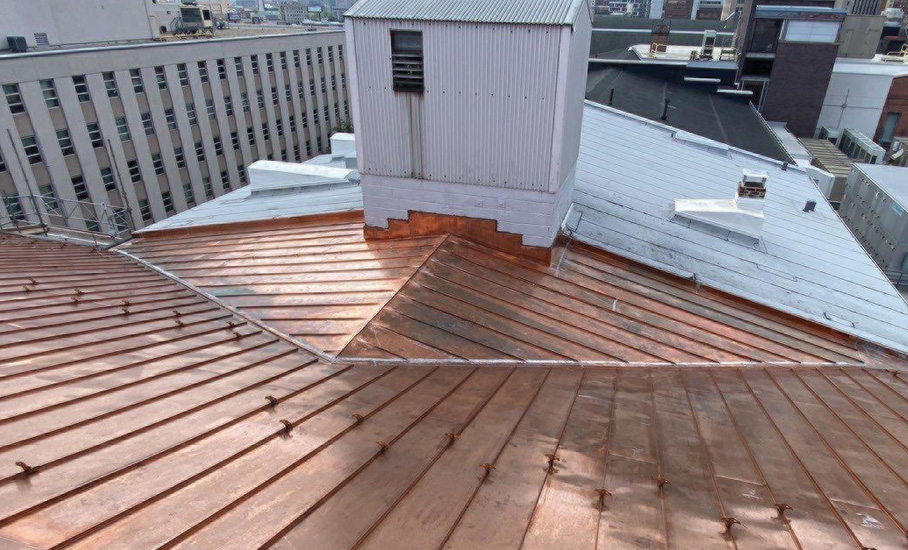 Craftsmen shop-fabricated new 20-ounce copper standing-seam roof panels on a roll-former machine. Custom crates were built to transport the 16-inch-wide panels with a 1 1/2 inch seam to the job site and lift them via crane to the roof.